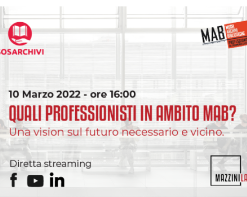 Se ne parlerà nel Workshop “Quali professionisti in ambito MAB?”, organizzato da SOS Archivi e MAB (il coordinamento creato tra AIB – Associazione Italiana Biblioteche, ANAI – Associazione Nazionale Archivistica Italiana e ICOM Italia – International Council of Museum) in programma in presenza e on line il prossimo 10 marzo a partire dalle 16.00.